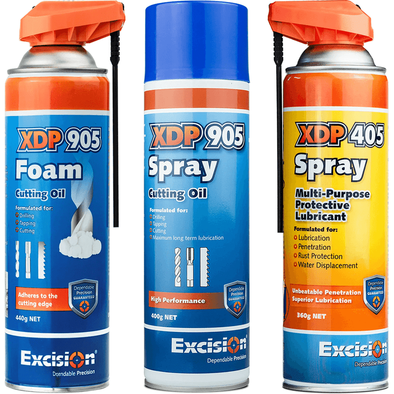 The all-in-one package for vertical and horizontal drilling, cutting and tapping, with a Multi-Purpose Lubricant spray! These Cutting & Drilling Lubricant Combos include the XDP905 Cutting Foam, XDP905 Spray Cutting Oil, & the XDP405 Multi-Purpose Lubricant Spray all in a 3 pack value combo. The XDP 905 Foam is a high-performance lubricant for cutting, drilling, and tapping metals, including stainless steel. Particularly useful for tapping and vertical surfaces, its advanced formula offers exceptional film strength, corrosion resistance, and increased tool life. The XDP905 Spray Cutting Oil is a high-performance lubricant ideal for deep boring and horizontal surfaces. Featuring an accurate nozzle for easy application, this low-viscosity oil protects against corrosion, reduces wear and friction, and increases tool life up to five times. XDP405 is a non-hazardous rust preventative with strong penetration capabilities, offering lasting surface protection against oxidation. It’s ideal for safeguarding tooling from corrosion during periods of inactivity and detaching rust-bound pieces.